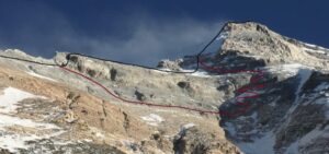 Photo; en noir le parcours emprunté officiellement par Malory et Irvine, en rouge le chemin qu’ils ont peut-être suivi pour tenter de rallier le sommet.
